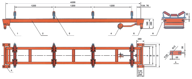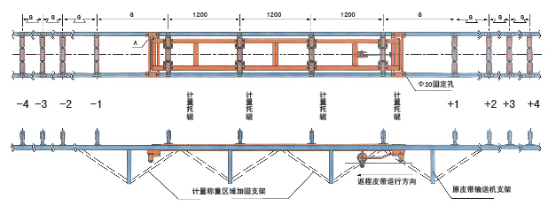 說明:1、稱重架 2、稱重橋 3、原輸送機(jī)托輥改制的計(jì)量托輥 4、測(cè)速車及測(cè)速傳感器 5、輔助輥 6、輸送機(jī)框架