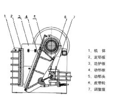 該系列破碎機工作方式為曲動擠壓型,其工作原理是:電動機驅(qū)動皮帶和皮帶輪,通過偏心軸使動顎上下運動,當動顎上升時肘板與動顎間夾角變大,從而推動動顎板向固定顎板接近,與其同時物料被壓碎或劈碎,達到破碎的目的;當動顎下行時,肘板與動顎夾角變小,動顎板在拉桿,彈簧的作用下,離開固定顎板,此時已破碎物料從破碎腔下口排出。隨著電動機連續(xù)轉(zhuǎn)動而破碎機動顎做周期運動壓碎和排泄物料,實現(xiàn)批量生產(chǎn)。